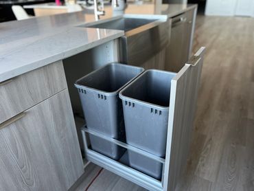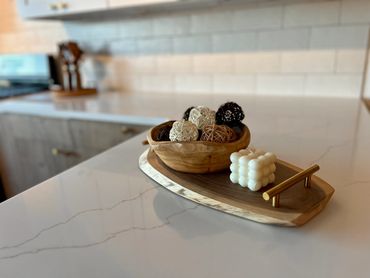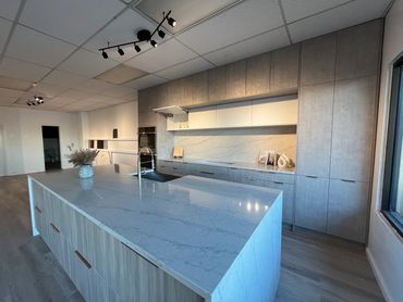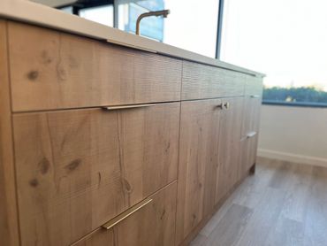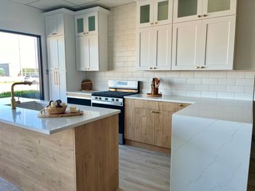 Charm of Rustic Oak - Elevate your culinary experience with our latest kitchen design that blends rustic warmth with contemporary white shaker. This inviting space features natural wood finishes on Gold quartz island, providing a generous workspace and a central gathering point for your home.