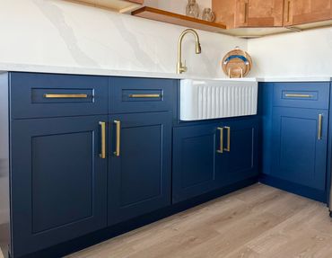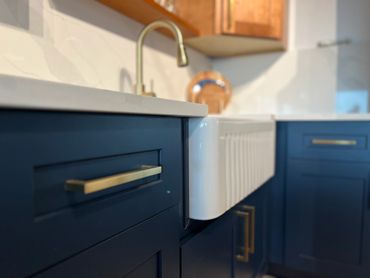 A Fusion of Vintage Chic - The blue traditional cabinets complemented by the natural warmth of wooden overhead storage. The elegant farmhouse sink and pristine full height backsplash merge classic comfort with vintage chic.