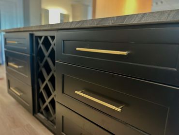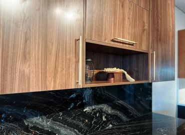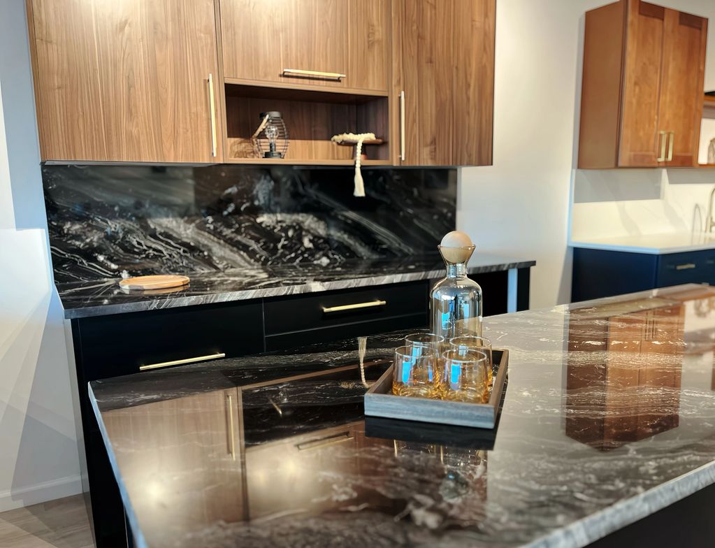 The Essence of Urban Luxury - When dark, dramatic granite meets the warm tones of European walnut cabinetry. Revel in the luxurious contrast that speaks to the connoisseur of fine living, with a bold backsplash and countertops that demand attention. Each element, from the gleaming gold accents to the modern, minimalist lines, is a testament to refined taste.