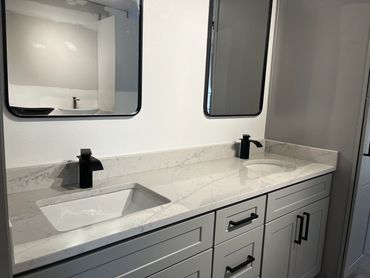 Contemporary Simplicity in Design - This masterpiece kitchen design strikes a balance between modern elegance and functionality. With concrete & white European cabinetry and gray veins quartz countertops, the space feels open and airy. The large island serves as the heart of the kitchen. Stainless farmer sink and double oven are integrated into the cabinetry, maintaining the minimalist aesthetic